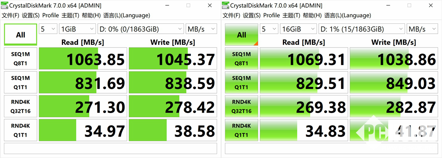 CrystalDiskMark1GiB(左)、16GiB(右)测试