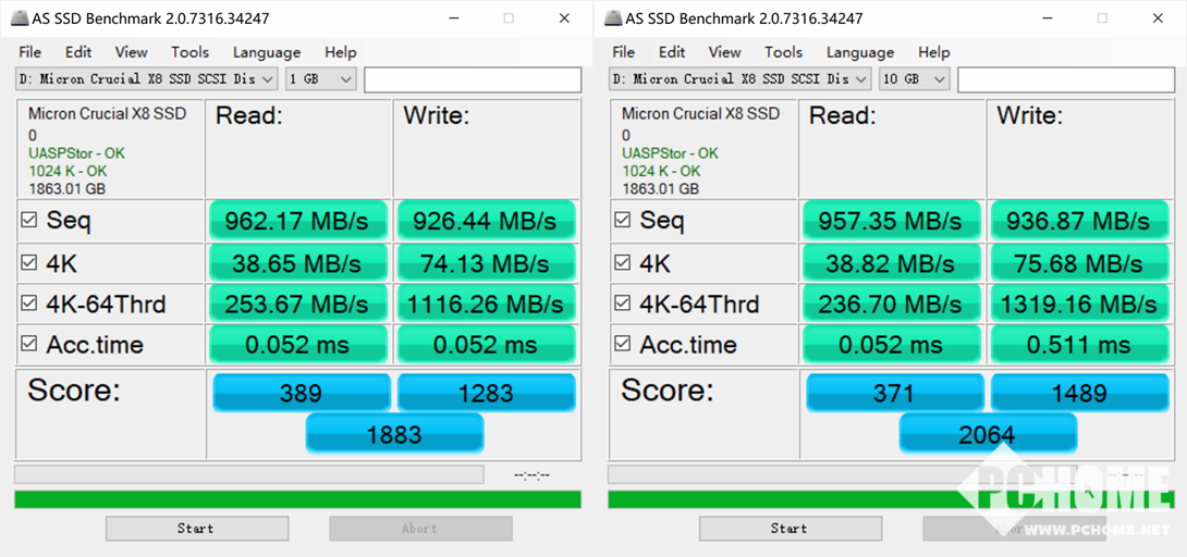 AS SSD Benchmark 1GB(左)、10GB(右)测试