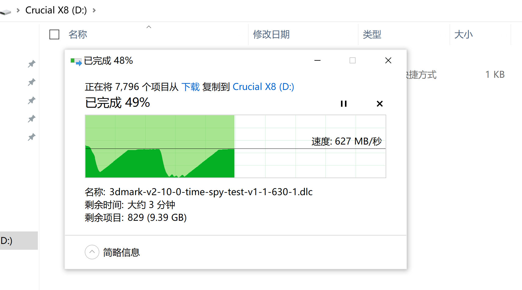 实际传输速度方面,我们向Crucial X8移动固态硬盘2TB版中拷贝了一个大小约为20GB的复合文件夹,内含视频、文档、系统文件、压缩包等多种不同类型、大小的文件,实测Crucial X8移动固态硬盘2TB版的最高写入速度可达627MB/s。