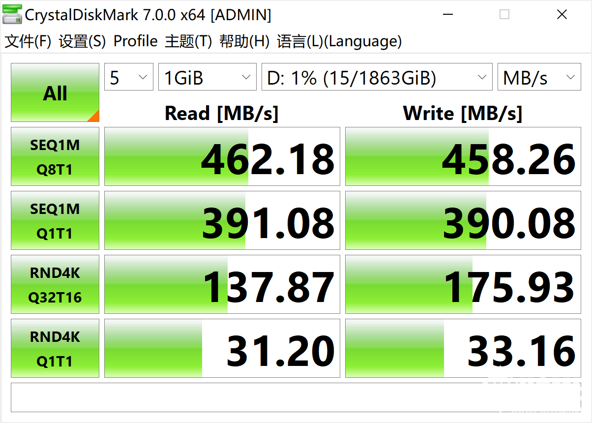 首先我们使用CrystalDiskMark进行测试,Crucial X8移动固态硬盘2TB版在Q8队列深度下的顺序读取速度超过了1GB/s,达到了1063.85MB/s,略微超过了官方标称值,顺序写入速度为1045.37 MB/s,表现十分稳定。而单线程单队列的4K随机读取速度为34.97 MB/s,4K随机写入速度为38.58 MB/s,表现中规中矩。16GiB区块大小的情况下,获得的测试成绩与1GiB下基本一直,性能没有明显变化。