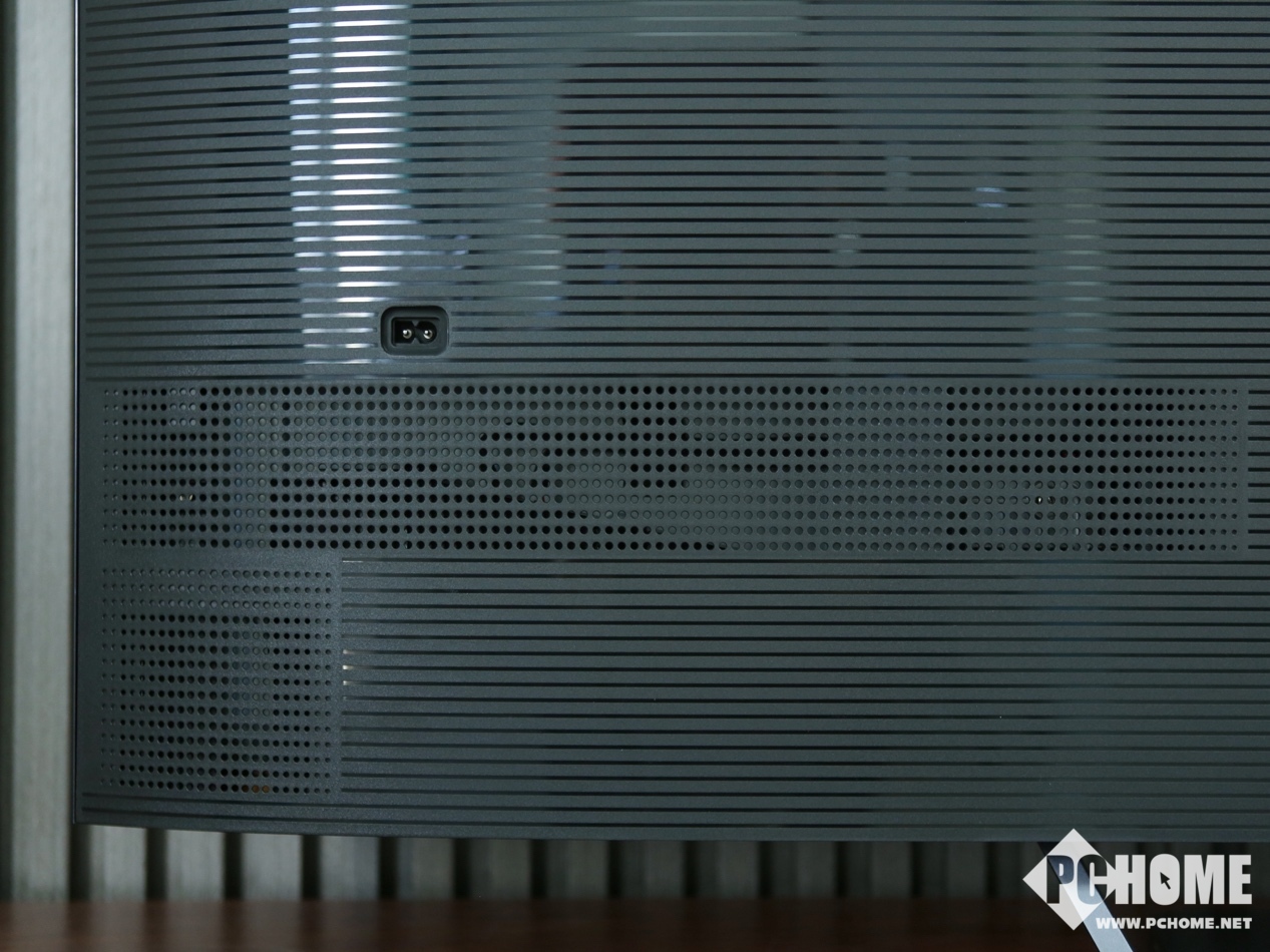 背部中间部分有两个非常吸引眼球的低音单元,而左右两个底角部分的音响单元也都通过镂空区域的方式进行标记,顶部摄像头两侧的散热孔内部就是天空音响单元,可以说OPPO智能电视S1的背部是将散热与音响单元完美结和在了一起的一款产品。
