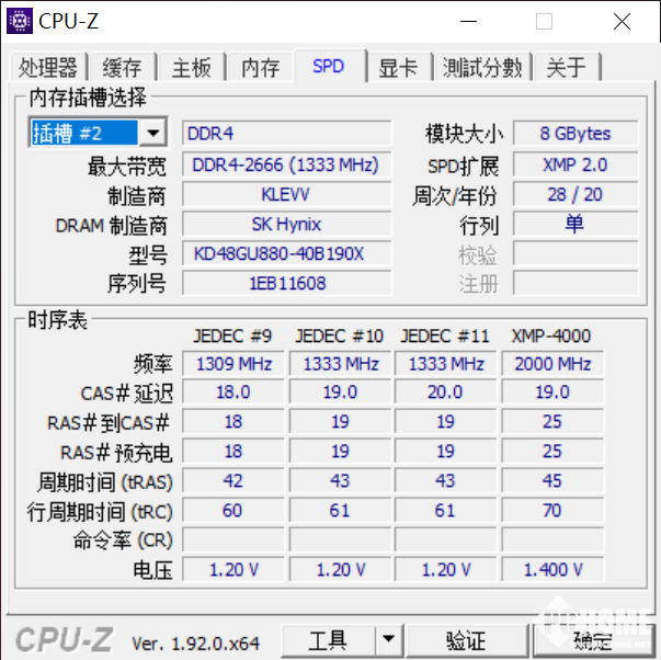 在主板的默认设置下,我们使用CPU-Z识别的内存信息如上图,可以看到这个时候工作频率为2666MHz,时序为19-19-19-43。接下来,我们就分别使用多款基准性能测试软件,测试科赋CRAS X RGB DDR4-4000MHz内存在@2666MHz频率下的性能表现。