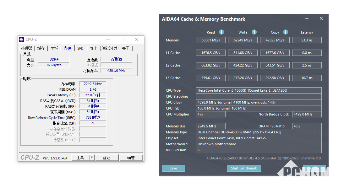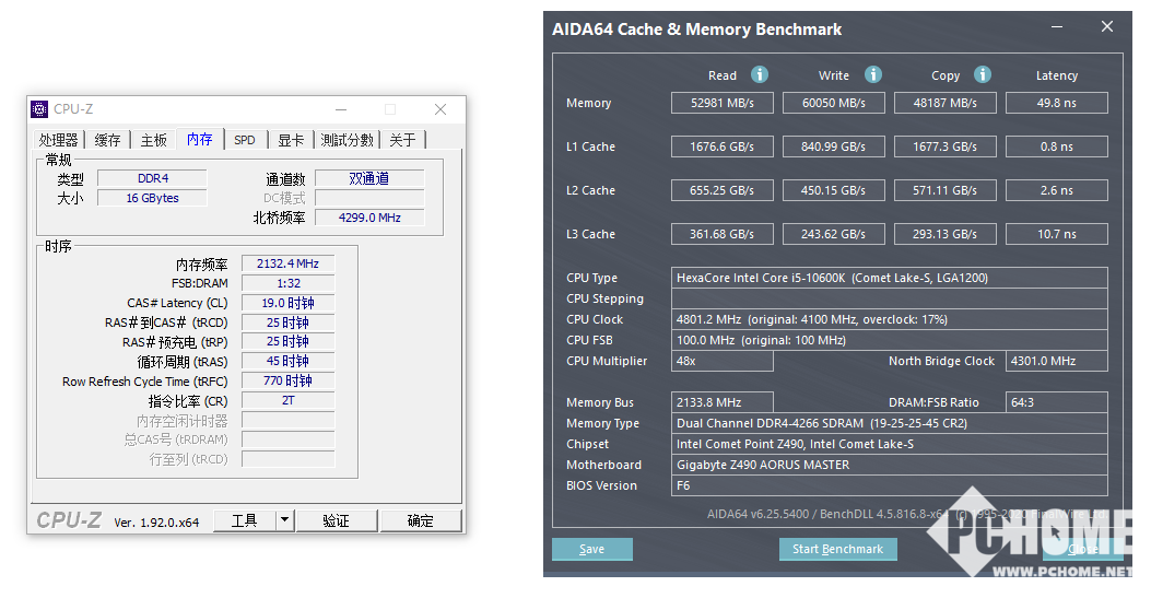因此,我们决定进一步向更高性能、更高频率发起冲击。在BIOS设置中关闭XMP之后,我们采用手动调节内存频率、电压、时序,经过反复尝试,最终科赋CRAS X RGB DDR4-4000MHz内存稳定运行在4266MHz的频率上,工作时序为19-25-25-45,内存工作电压1.45V,此时平台的内存性能进一步提升,在AIDA64 Cache & Memory Benchmark的测试中,内存读取、写入、复制的速度相比4000MHz有着明显提高,延迟表现也更好,达到了性能新高度。