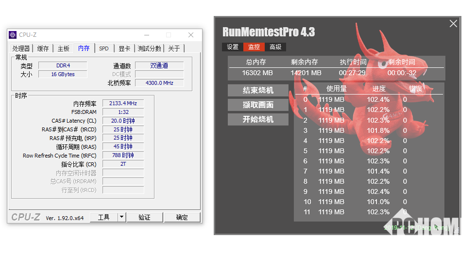 稳定性表现方面,我们使用RunMemtestPro 4.3进行烧机测试,在半个小时的时间里,系统完美通过,没有出现错误,看起来科赋CRAS X RGB DDR4-4000MHz内存工作在4266MHz的频率下也是毫无压力的。