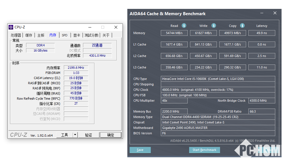 对于性能的追求当然是没有止境的,既然4266MHz难不倒科赋CRAS X RGB DDR4-4000MHz内存,我们又进一步加码,将频率提升至4400MHz,经过调试,最终依然可以成功运行,此时时序依然为19-25-25-45,与内置的XMP 4000MHz时序一致,表现令人惊喜。在AIDA64 Cache & Memory Benchmark的测试中,内存读取、写入、复制的速度分别达到了54744 MB/s、61827MB/s、49973MB/s,延迟降低至49.9ns,性能更加极致。