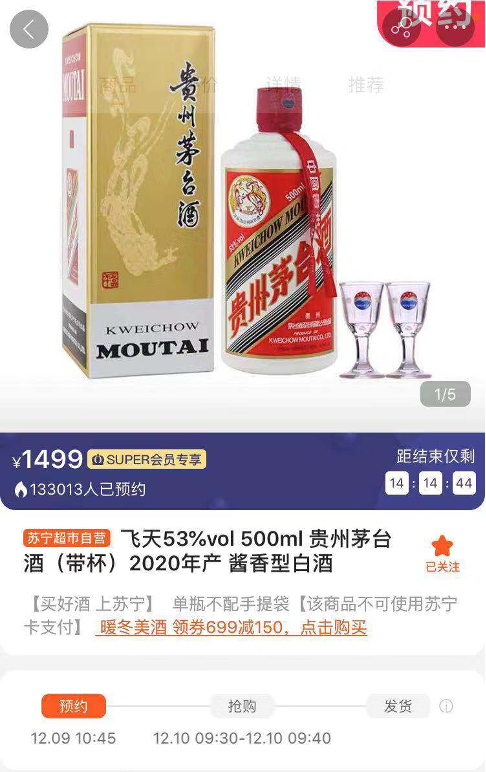 价格方面,作为贵州茅台酒全国综合类电商中标企业,苏宁易购将继续保持1499元的平价供应。