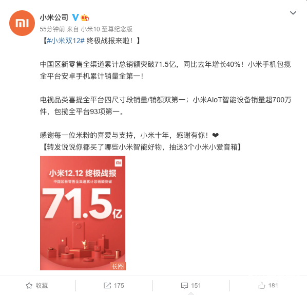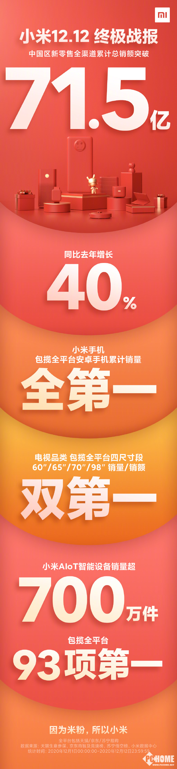 2020年双12优惠促销正式结束,小米公布了今年双12的销售战绩,电视品类喜提全平台四尺寸段销量/销额双第一;小米AIoT智能设备销量超700万件,包揽全平台93项第一。
