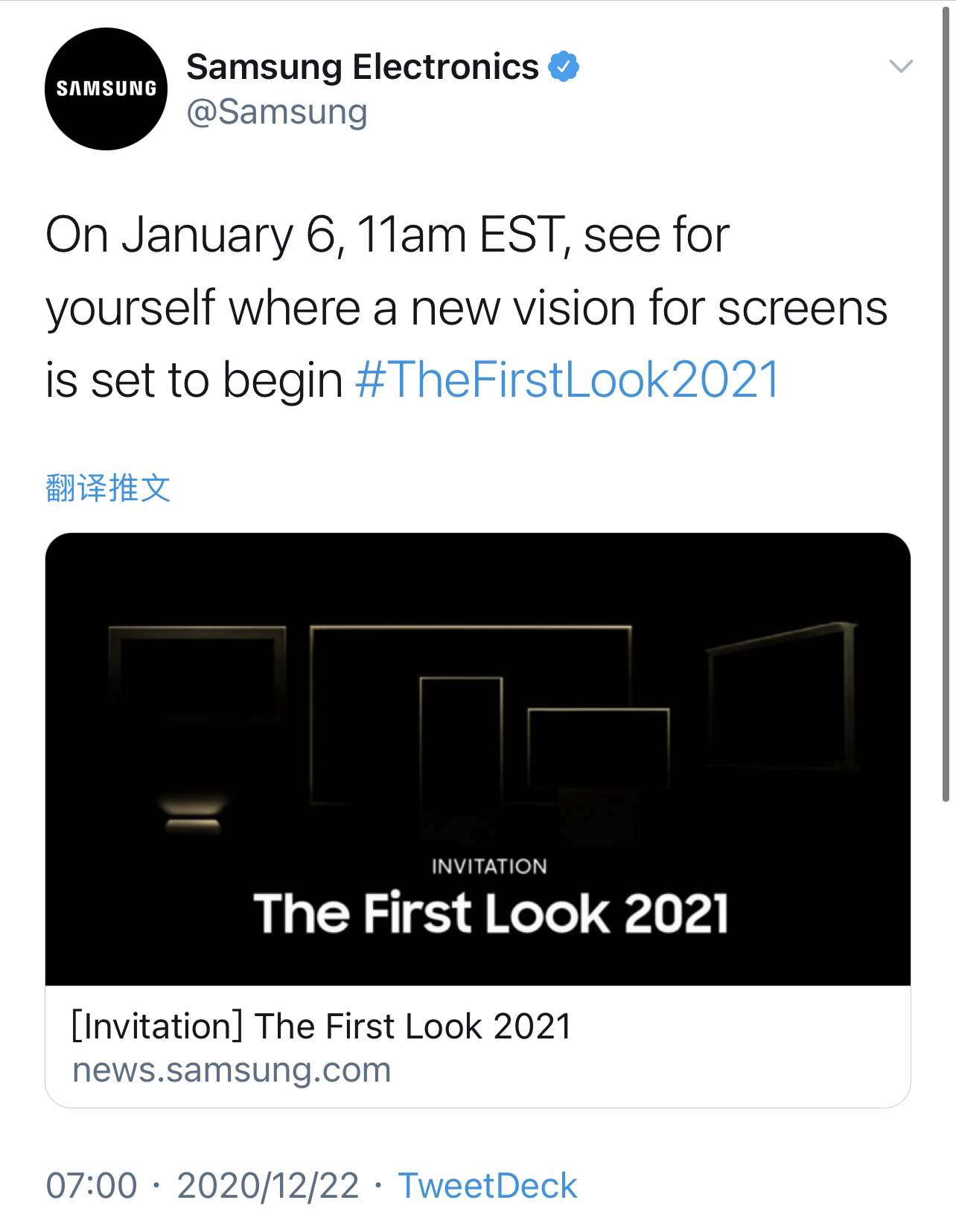 12月22日,@Samsung Electronics在Twitter上正式发布消息称将于北京时间1月7日正式举办2021年新品发布会会--The First Look 2021。