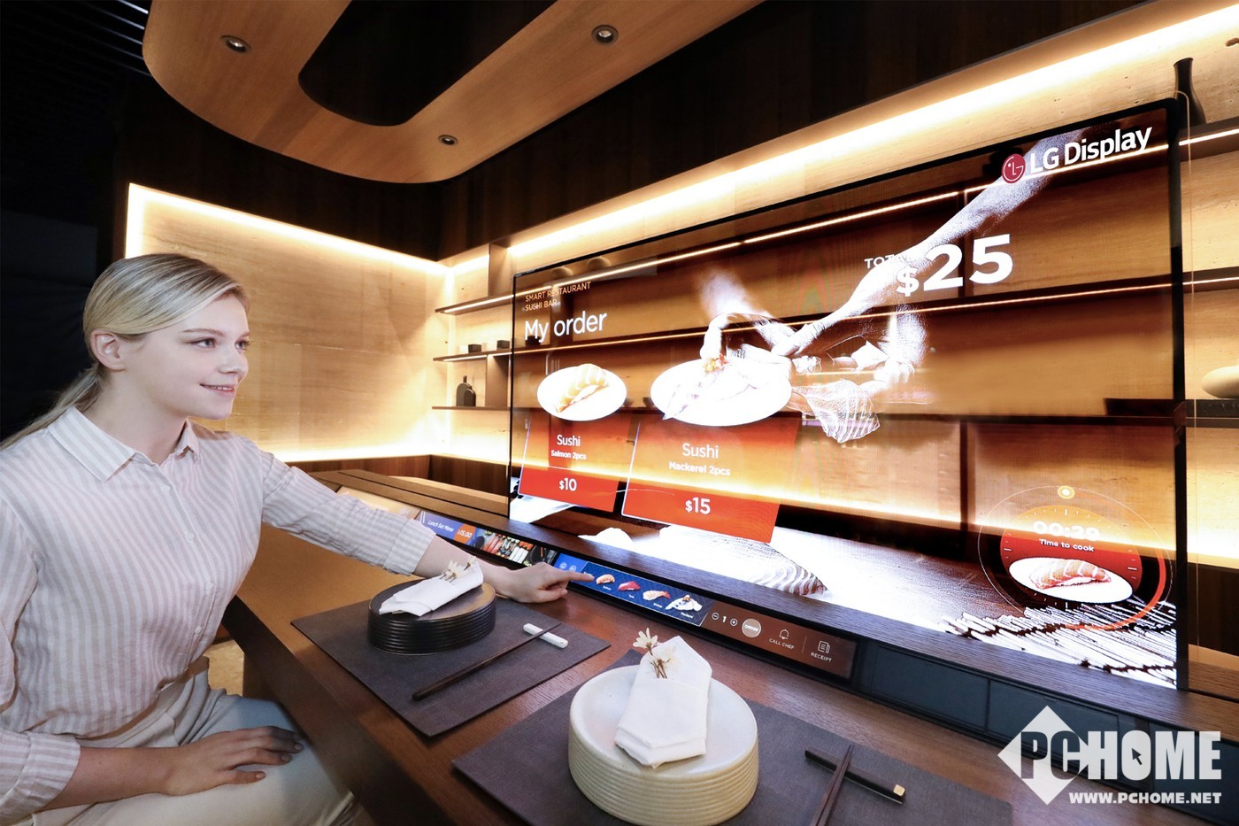 据Hybebeast消息显示,LG为透明面板商用化提供了以智能家居、地铁以及餐厅等三种透明OLED面板概念产品的展示区域。其中餐厅展区则是放置了一块55英寸的透明OLED屏幕,面板透明度达到了40%,相较于一般LCD面板的10%透明度来说有更好的通透性。此屏幕的用途在于食客在点餐的同时还可以看到屏幕另一边厨师的操作,屏幕也降低了其中的飞沫传播风险。