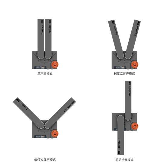 传统的枪式麦克风以单管式结构为主,部分能收立体音、有双管设计的枪麦往往会根据麦克风的拾音算法,将其结构固化。而Traxshot采用可变式结构设计,根据其拍摄方式,配合麦克风的两个干涉管的相应调整位置以及后台系统设置模块,选择不同类型的拾音模式。目前Traxshot可快速切换成三类模式,分别为单声道模式、两级立体声模式以及前后拾音模式,根据不同的使用场景及使用需求,选择不同的模式。