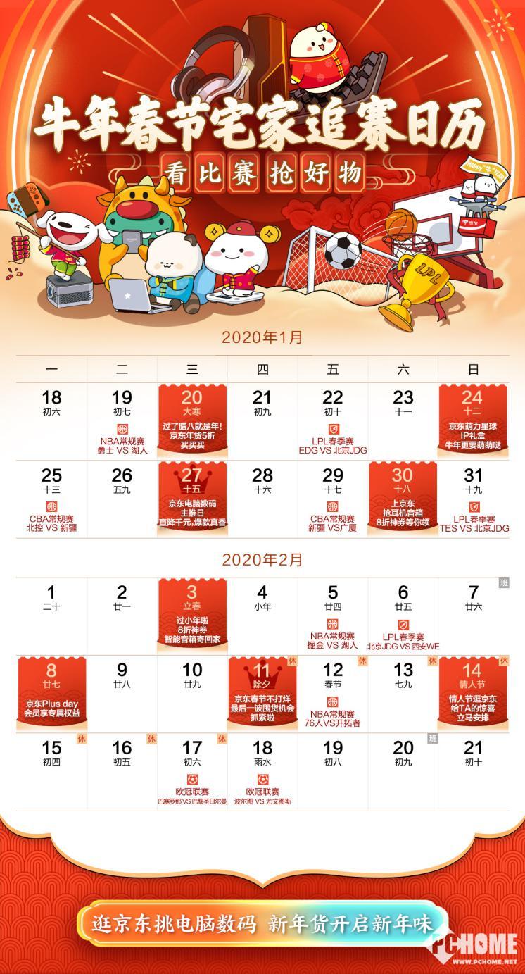 与此同时,为了让大家畅快观赛,这张日历上还贴心列出了京东电脑数码年货节抢购节点,让大家看比赛的同时,还能抽空抢到性能爆炸的电子装备,不管是投影大屏看NBA常规赛、欧冠联赛,还是拿着电竞本边看LPL春季赛,边与伙伴开黑。有了这张攻略图,“原年人”们过年想无聊都难!