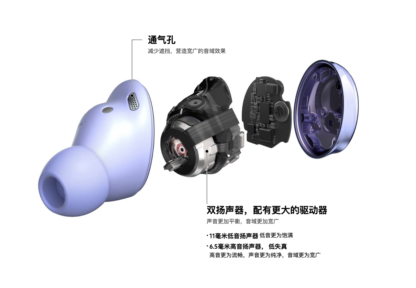 功能方面Galaxy Buds Pro支持主动降噪技术,通过内外两枚麦克风协同工作来实现降噪效果,可以过滤掉99%的环境噪音,支持2档主动降噪以及4档环境音模式调节,与此同时耳机本身还支持智能通话技术,当外侧麦克风检测到对话时会自动开启环境音模式并降低音量以保证流畅的通话,通话结束后则会恢复到之前的状态。并且Galaxy Buds Pro还支持空间音频技术,当头转向不同角度时都保证声音仍旧是从正面传出。同时其也支持多设备之间的跨设备快速连接,自动连接需要音频支持的设备,无需手动切换调节。