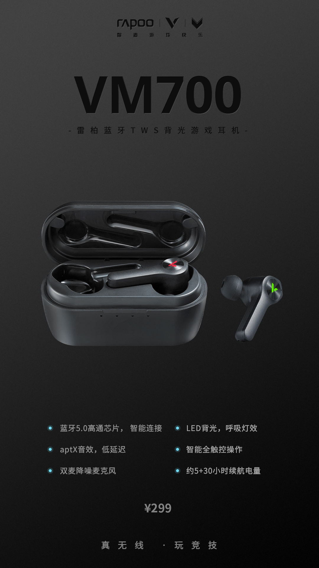 雷柏VM700蓝牙TWS背光游戏耳机,真无线·玩竞技。