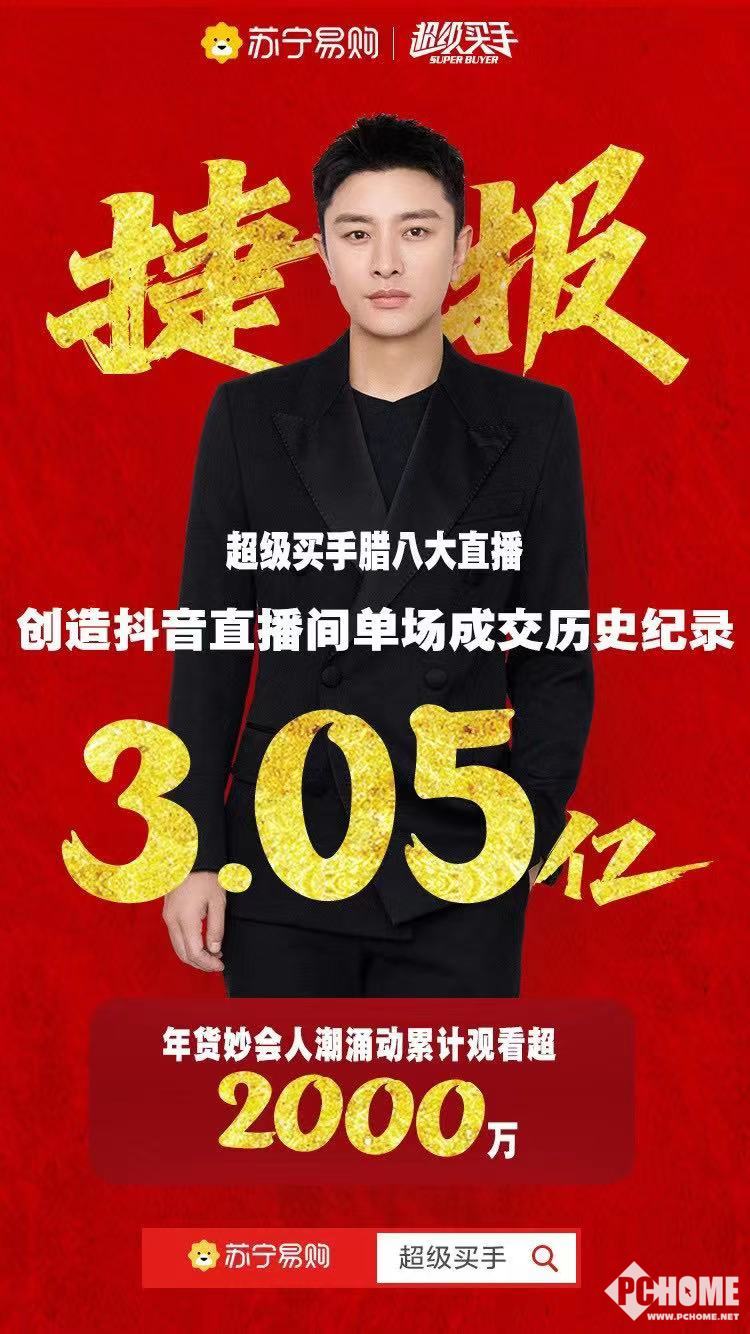 1月21日,0点45分,苏宁、抖音双渠道数据显示,超级买手直播间单场成交额破3.05亿,创造抖音单场带货新纪录,为苏宁网上年货节拔得头筹。