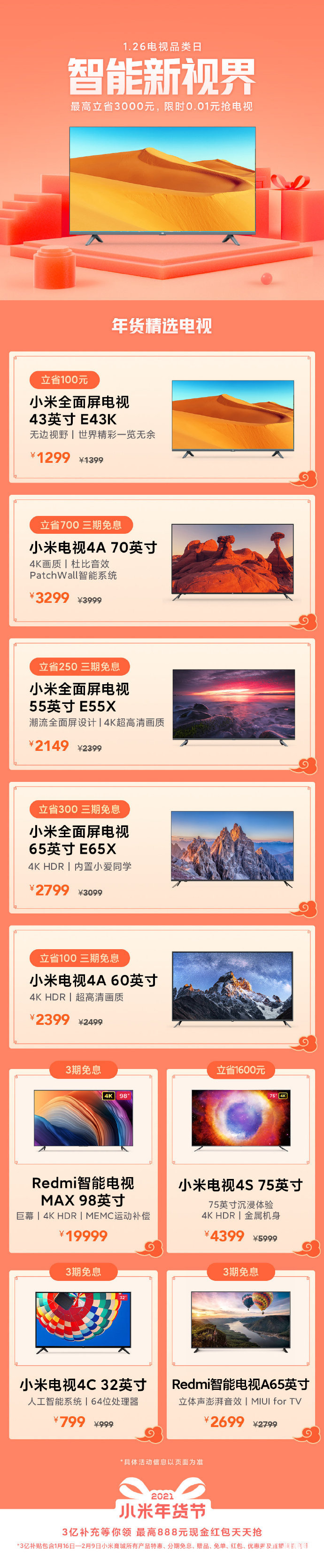 据了解,此次小米年货节电视品类日下单最高立省3000元,多款电视可享分期免息。