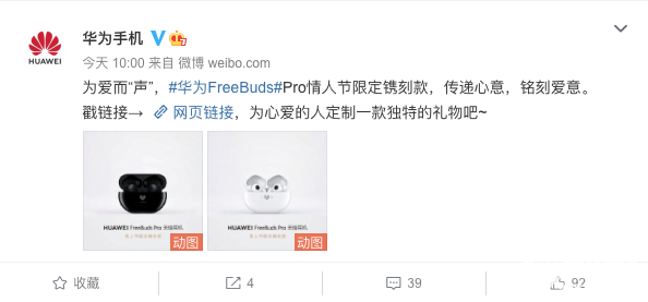 时间进入二月,除了农历新年之外最重要的就是情人节了,华为近日上架了华为Freebuds Pro耳机情人节款,与普通版本相比,情人节款在其基础之上增加了心形篆刻,使得其可以搭配为情侣款使用。