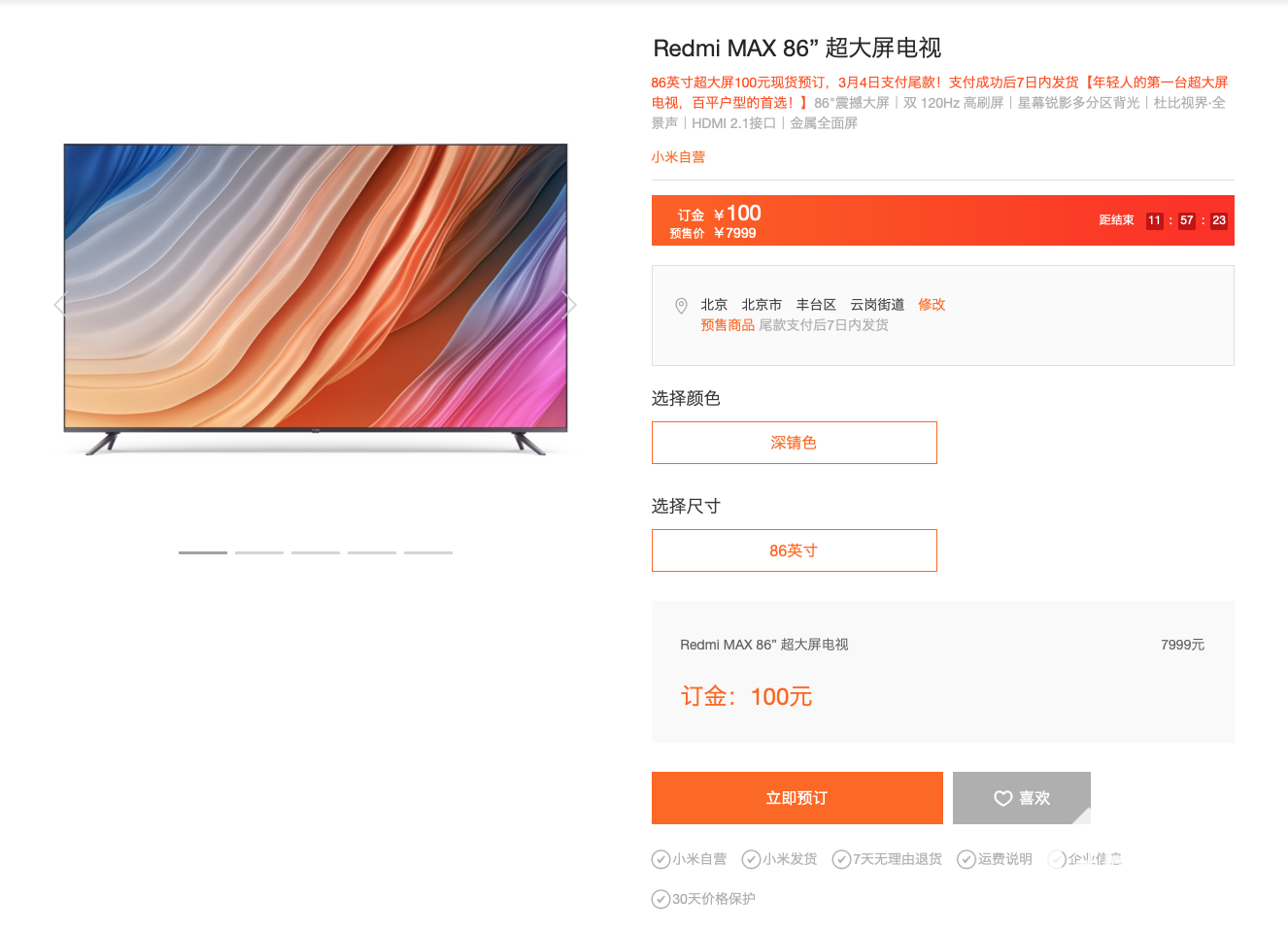 3月3日,Redmi MAX86"智能电视正式开启首销,售价7999元,此前缴纳过定金的消费者可于3月4日支付尾款,支付后7天内发货。