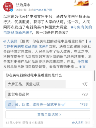 人民网官方微博发起了一场#与你有关的电器品质新未来#投票调查。针对大家关注度较高的选购电器的主要因素,投票选项中包含了大牌正品,国货电器品牌,一站式平台以及配送速度、退换货服务,价格优惠等多项内容。