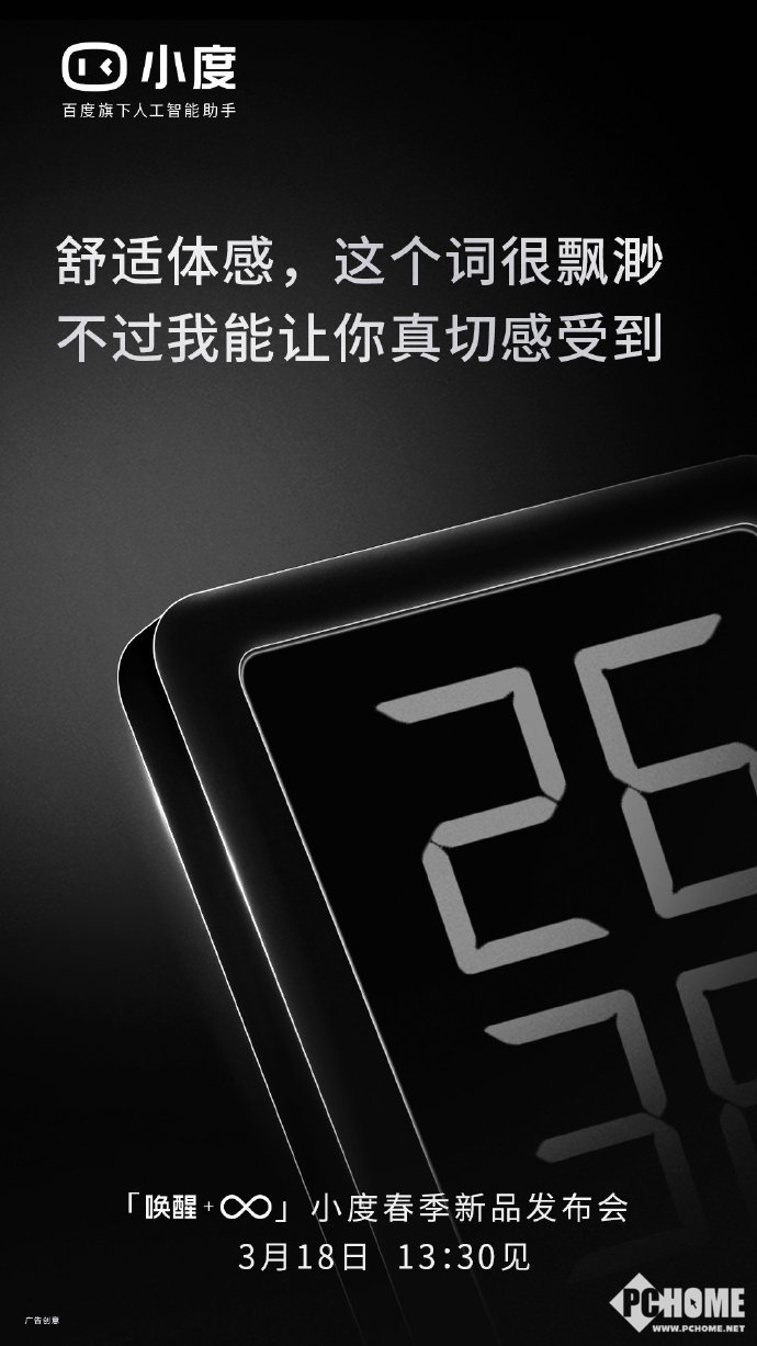 根据小度发布的海报来看,上面写有“舒适体感,这个词很飘渺。不过我能让你真切感受到。”并且在下方有一款产品的一角,上面标有数字,预测是温度或者湿度。