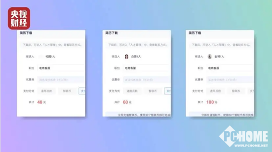 智联招聘客户顾问说:“校园简历是40元一份,白领简历60元一份,金领简历100元一份,金领简历是985、211本硕连读,在行业内有5到10年经验的,年薪在30万元以上的高端简历。”记者体验发现,通过企业账户,只要交钱办理会员,就可以不受数量限制下载包含姓名、电话及邮箱地址等关键信息的完整简历。