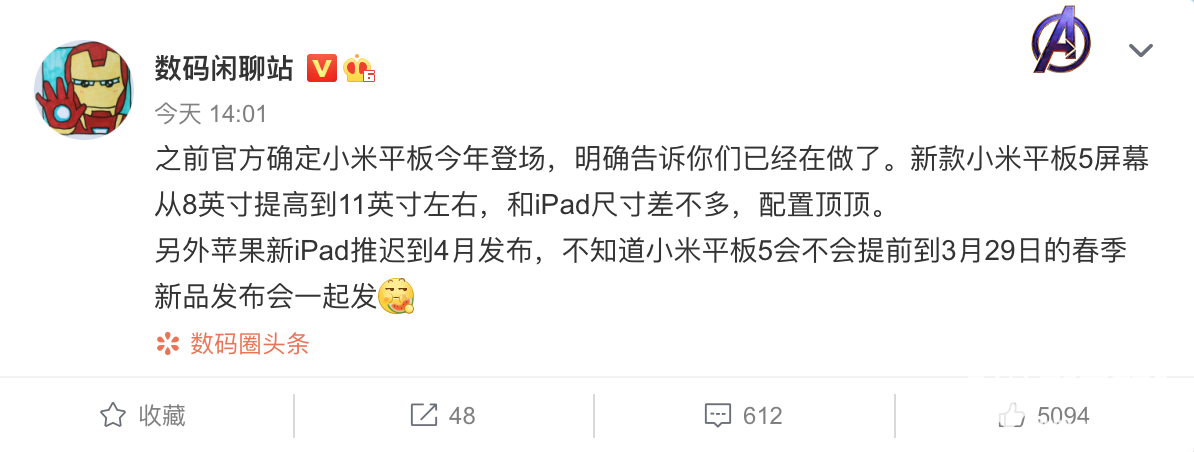 3月22日,微博博主@数码闲聊站发布消息称:“之前官方确定小米平板今年登场,明确告诉你们已经在做了。”