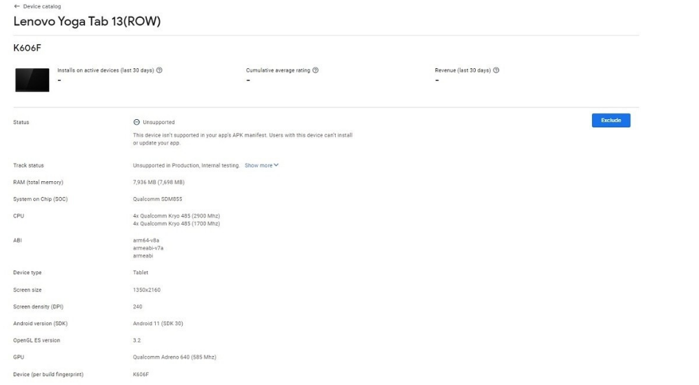 根据Google Play控制台显示Yoga Tab 13(ROW)采用1350x2160分辨率屏幕,屏幕比例为16:10。在配置上,这款平板配备8GB+128GB存储,运行系统为基于安卓11的ZUI 12.5.11。这些配置和联想官方曝光的新款平板的配置还是相同的。