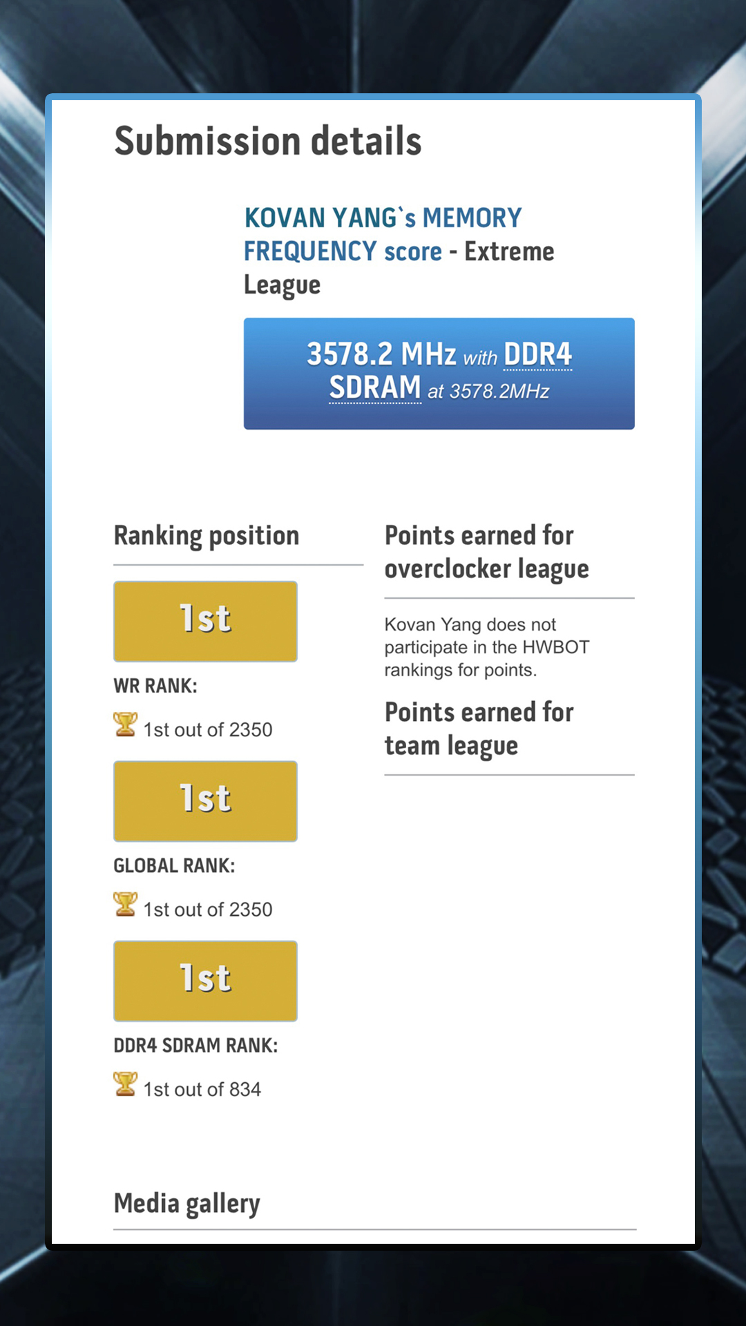 2021年4月1日,HyperX正式宣布旗下高端内存产品Predator DDR4掠食者系列骇客神条的频率达到了7156MHz,刷新了内存超频的世界纪录。测试产品采用的是HyperX DDR4掠食者系列骇客神条8G 4600MHz内存,测试平台是微星MEG Z590I UNIFY主板和Intel十一代酷睿i9-11900KF 3.50GHz CPU创造的。7156MHz的超频纪录也同时在HWBOT上进行了发布,这是一个电脑爱好者获取超频、基准测试和竞赛资讯的专业网站。