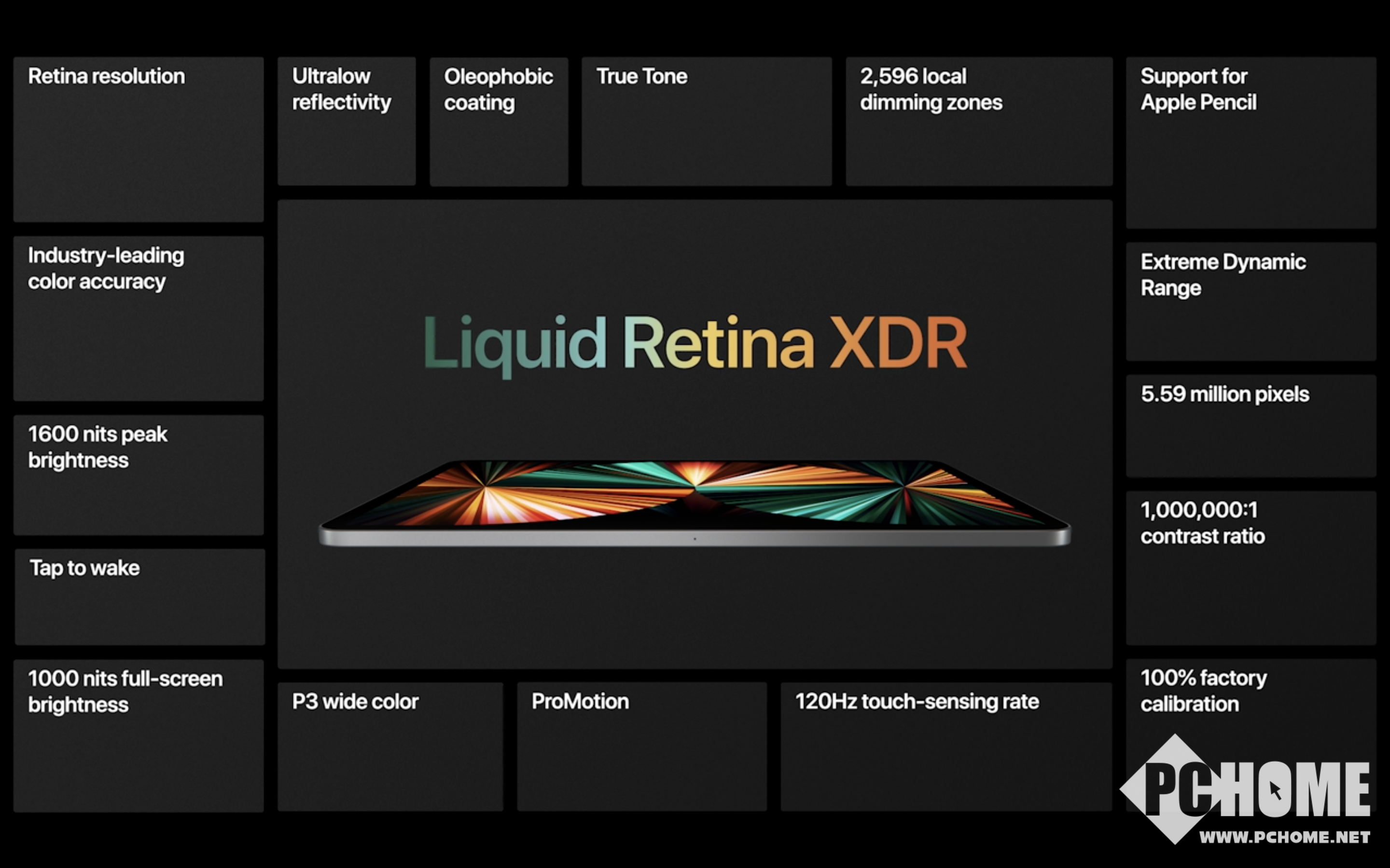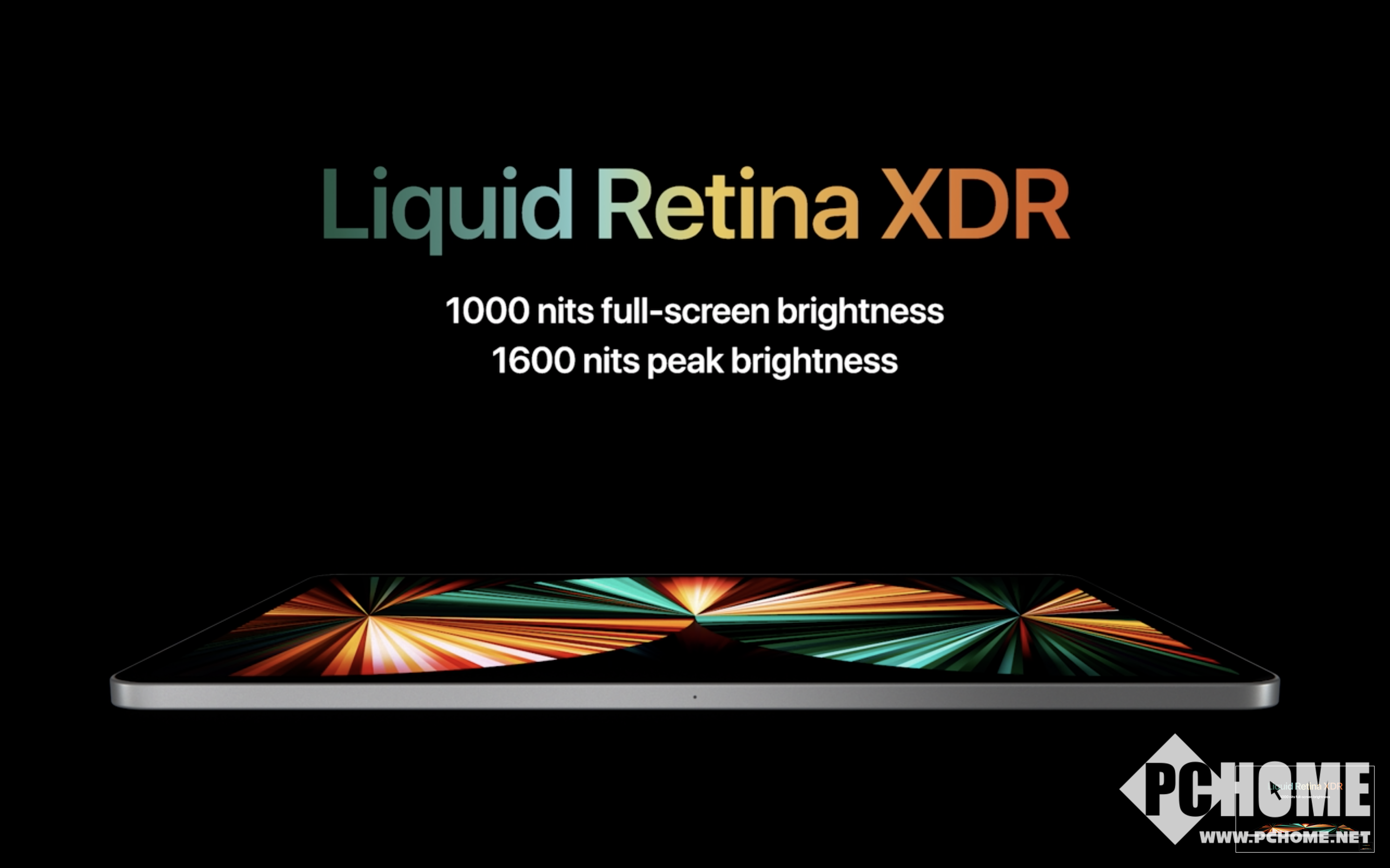 显示屏幕部分也是今年iPad Pro升级最大的部分,12.9寸版本采用了MiniLED面板,苹果称其为Liquid Retina XDR。其内置了超过10000个LED模组,可以达到全局1000nit亮度以及峰值1600nit亮度,同时可以实现100万:1的对比度,这也是目前苹果最好的一款移动端面板。