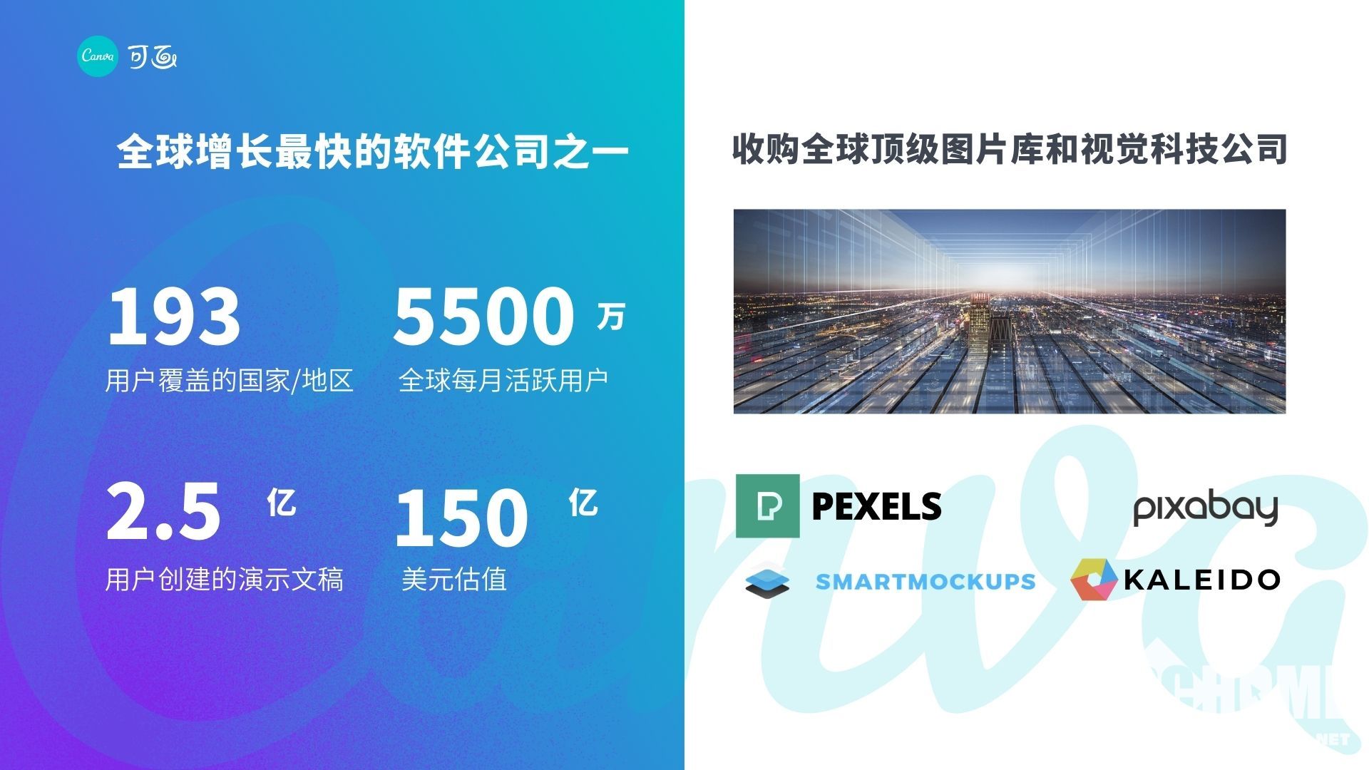 Canva拥有海量且持续更新的版权图片和字体素材库,已经收购了全球最大的免费图片网站Pixabay和Pexels,去年和今年又收购了在线智能抠象公司Kaleido,以及图片原型创建网站Smartmockups。在中国也与视觉中国以及汉仪字库达成战略合作伙伴关系,为中国用户提供海量可商用版权图片和中文字体,力求为中国用户提供优质的本地化产品体验。