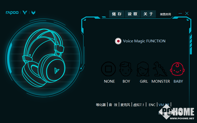 麦克风界面和ENC界面主要可以调节麦克风增益效果和降噪效果。另外驱动还有一个有趣的VM Eff功能,可以改变玩家声音特性,变成萝莉音、婴儿音、大叔音,可玩性十足。
