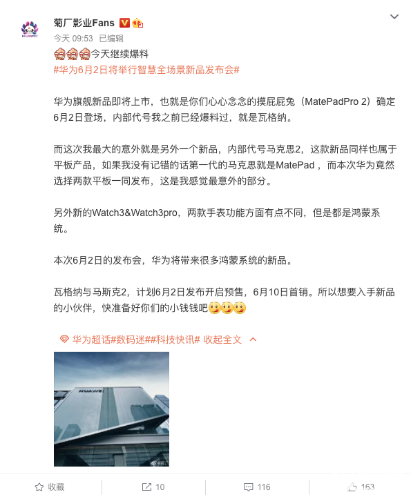 近日,微博@菊厂影业Fans爆料称华为将于6月2日发布全新的MatePad Pro 2以及MatePad、华为Watch3/Watch 3 Pro,同时以上产品均搭载华为鸿蒙OS。