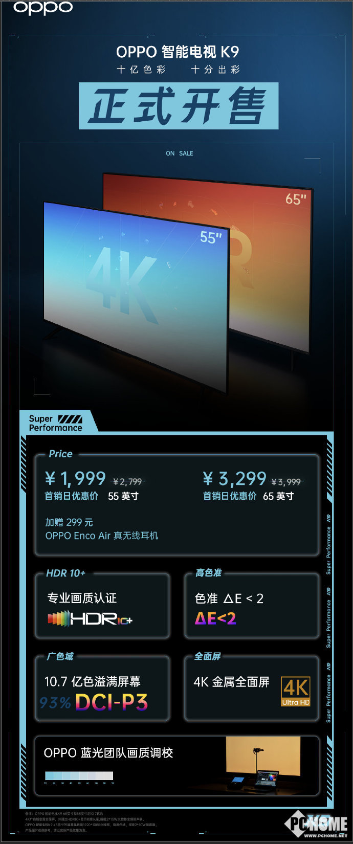 5月18号消息,通过HDR10+专业画质认证,采用4K金属全面屏的OPPO智能电视K9今天正式开售,55英寸首销优惠价1999元,原价2799元,购买还加赠299元耳机;65英寸首销优惠价3299元,原价3999元。