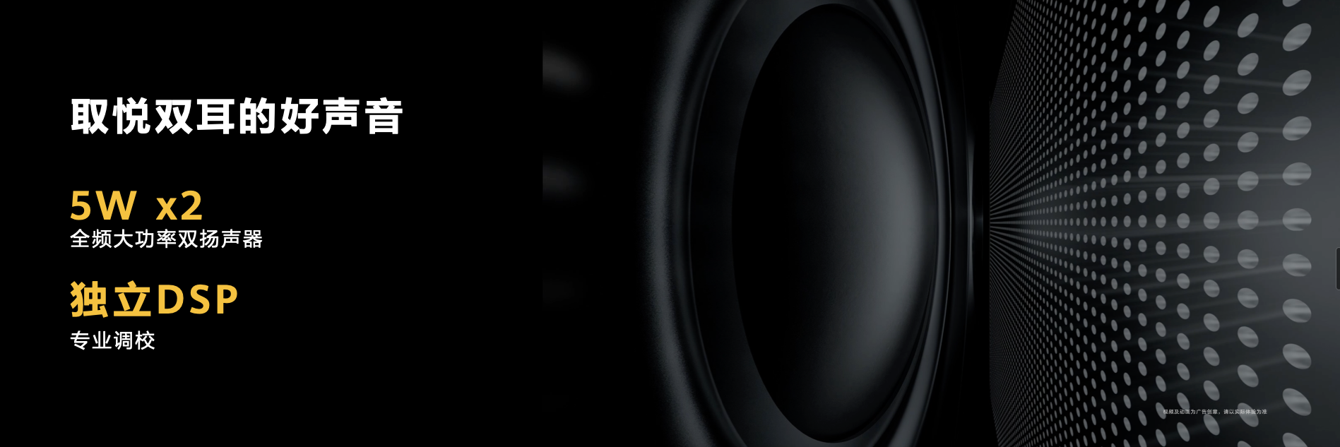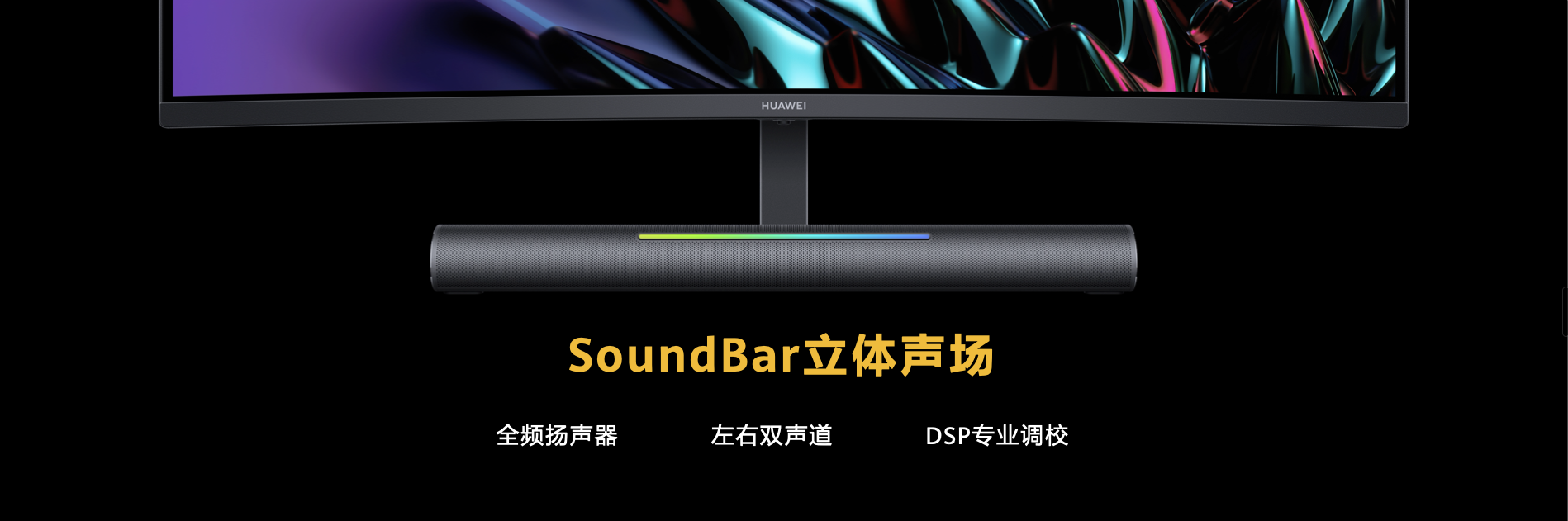 华为MateView GT首创了一体式SoundBar底座,既是底座也是双扬声器。SoundBar底座采用烤漆工艺打造,内置两个全频喇叭单元,支持2.0声道,同时还融入了34 CC大音腔设计,最终呈现出澎湃的环绕式立体音效;为了给用户带来更炫酷的交互体验,华为还为SoundBar 增加了一条炫彩的RGB灯光区域,并创新性地加入了触控式音量调节功能,单指即可调节音量,光随指动,音量调节更简单。