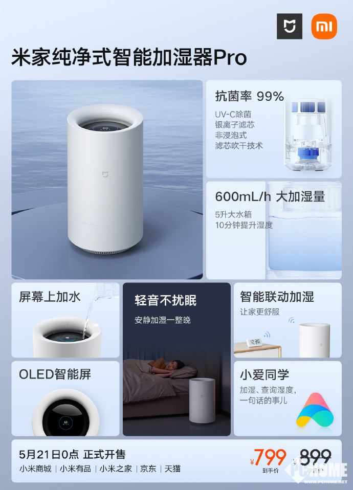 5月21号消息,米家纯净式智能加湿器Pro正式开售,拥有三重抗菌净化,可以减少滤芯异味、发霉等问题、5升大水箱和600mL/h超大加湿力可以10分钟提升卧室湿度。