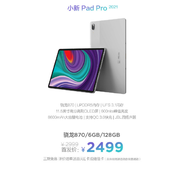 小新Pad Pro 2021搭载骁龙870处理器,6GB+128GB存储。目前正在预约中,首发价2499元,原价2999元,购买还可享3期免息。