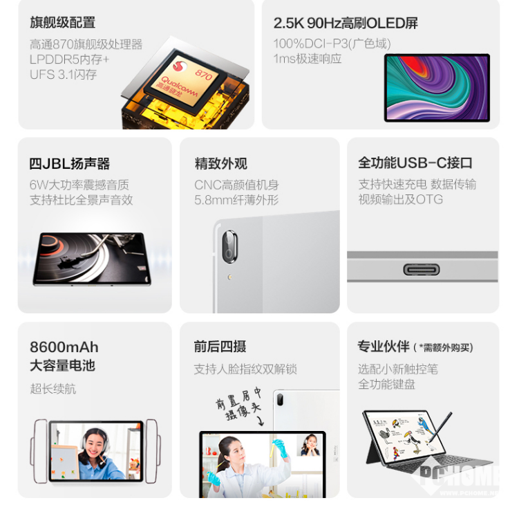 续航方面,小新Pad Pro 2021配备8600mAh超大容量电池,足够用户使用一天,并且这款平板支持QC 3.0快充,可以快速回血。
