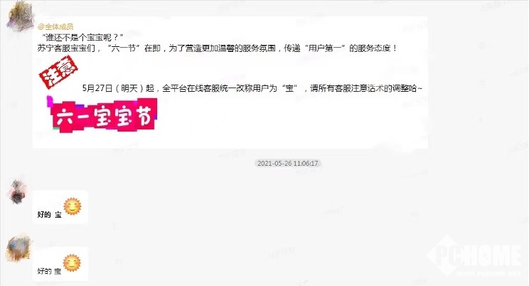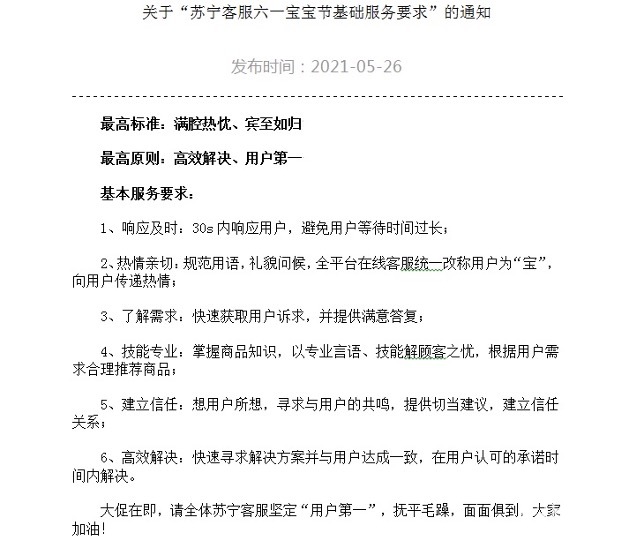 5月26日,苏宁客服发布内部通知称,“为了营造六一宝宝节更加温馨的服务氛围,传递‘用户第一’的服务态度。5月27日起,全平台在线客服统一改称用户为‘宝’。”