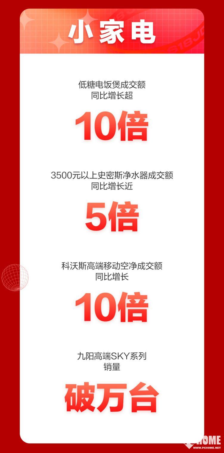 小家电中,高端智能生活电器品牌添可0点后3分钟成交额就超过去年同期20倍,稳居洗地机品类第一,其高端产品芙万2.0上市仅2个月,销售占比就超过50%。C2M反向定制的京品家电科沃斯N9+成交额抢占扫地机器人类目第一。九阳高端sky系列1小时销量破万台,而且单价高于行业3.5倍,不用手洗破壁机成交额成为TOP1,引领了行业结构升级。苏泊尔炒菜机器人成功引领行业,成交额抢占TOP1。作为创新单品,摩飞气泡原汁机成为年轻用户首选。飞利浦剃须刀针对敏感肌的新品继续引领剃须刀品类新趋势的增长。雅萌水光钻美容仪相比老产品更受到女性用户青睐。映趣全身水洗剃须刀1小时销量突破万台,东芝进口微波炉成交额稳居开放平台微波炉销售第一名。美的新品彩板电磁炉上市2个月就冲进开放平台成交额排名TOP10,提升了在高端电磁炉的品牌占比。