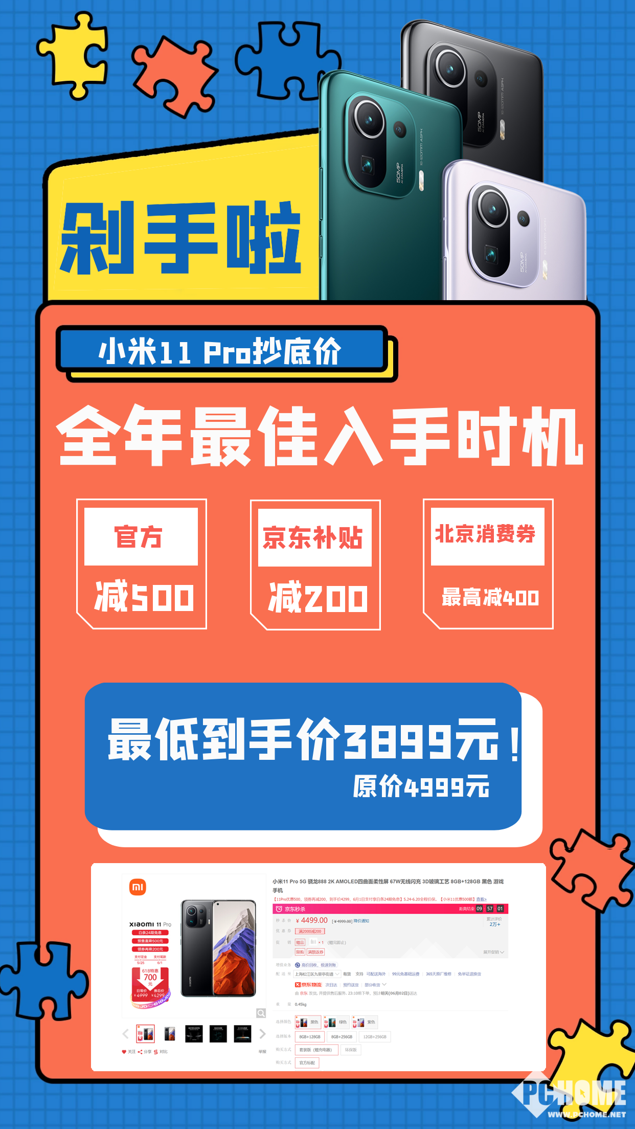 据悉,在京东平台,小米11Pro享受官方降价500元+京东平台补贴200元+北京消费券最高400元(限6月1日-6月3日之间领取)的促销活动,最低起售价仅为3899元。