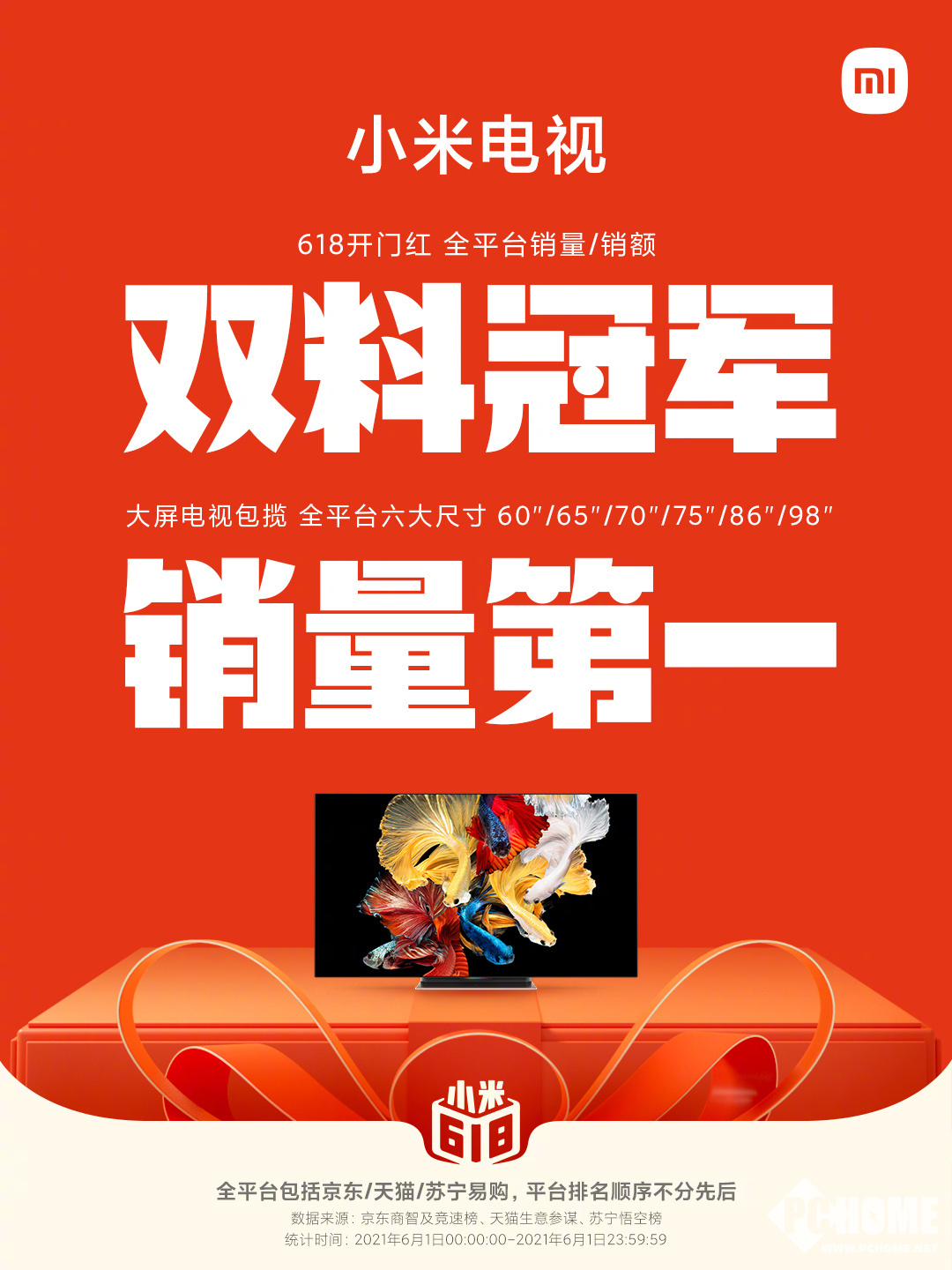 6月1日0时开始,2021年618活动全面开启。截止6月1日24时,小米电视拿下了全平台销量&销额双料冠军,大屏电视包揽全平台六大尺寸销量第一。
