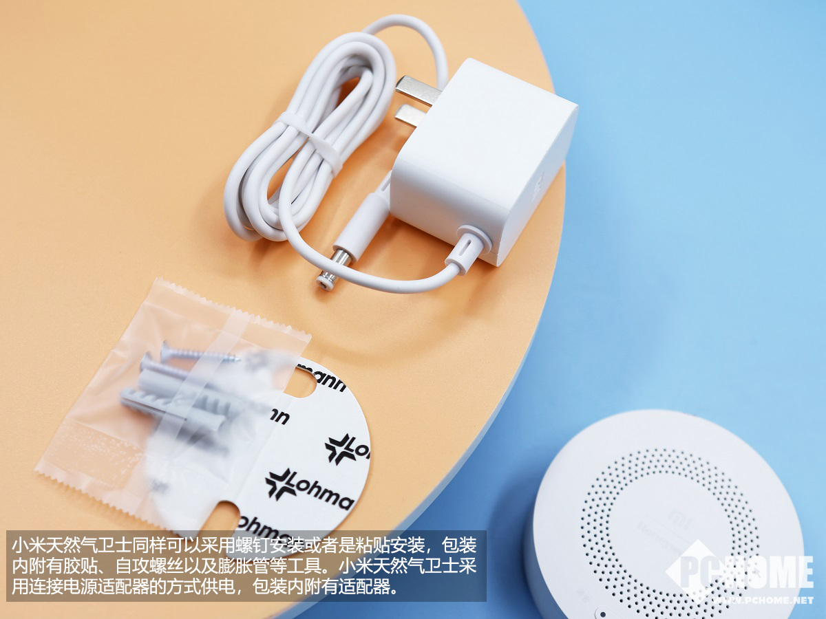在安装方面,小米烟感卫士以及小米天然气卫士都有两种安装方式,一种是螺钉安装,一种则是粘贴安装,用户可以根据自家情况以及使用习惯自行选择。在包装内附有自攻螺丝、膨胀管以及胶贴等等工具。小米烟感卫士通过安装电池供电,小米天然气卫士通过电源适配器供电。