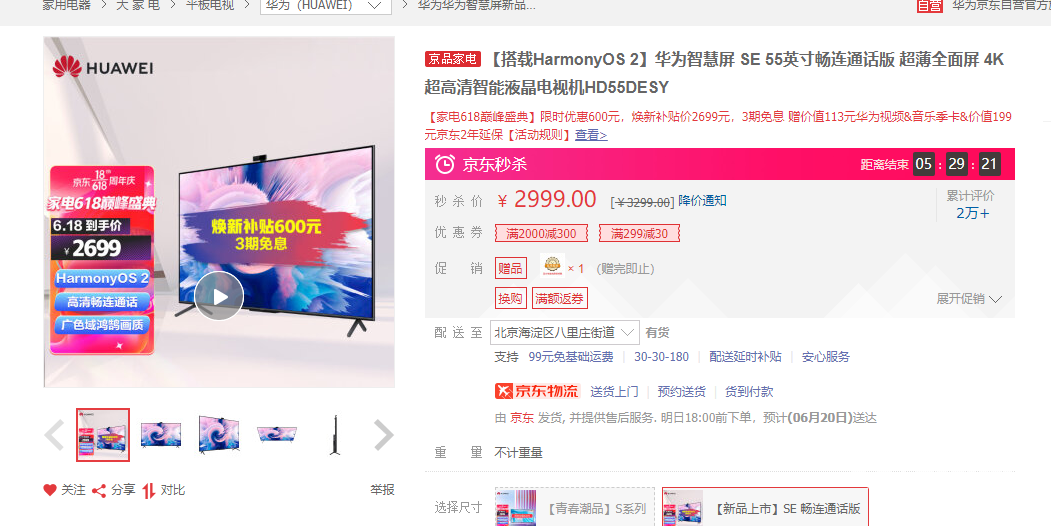 目前华为智慧屏SE 55英寸限时优惠600元,618到手价2699元,还可享3期免息。购买华为智慧屏SE 55英寸还可获赠价值113元华为视频&音乐季卡&价值199元京东2年延保。
