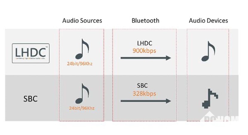 LHDC支持通过速度最高达900kbps的蓝牙连接传输 24bit/96kHz 的串流音频(也称高解析度音频)。相较于LDAC优先把原始音频进行升/降频到 24bit/96kHz的规则不同的是,LHDC可以依照原始取样率输出,减少SRC过程的延迟。