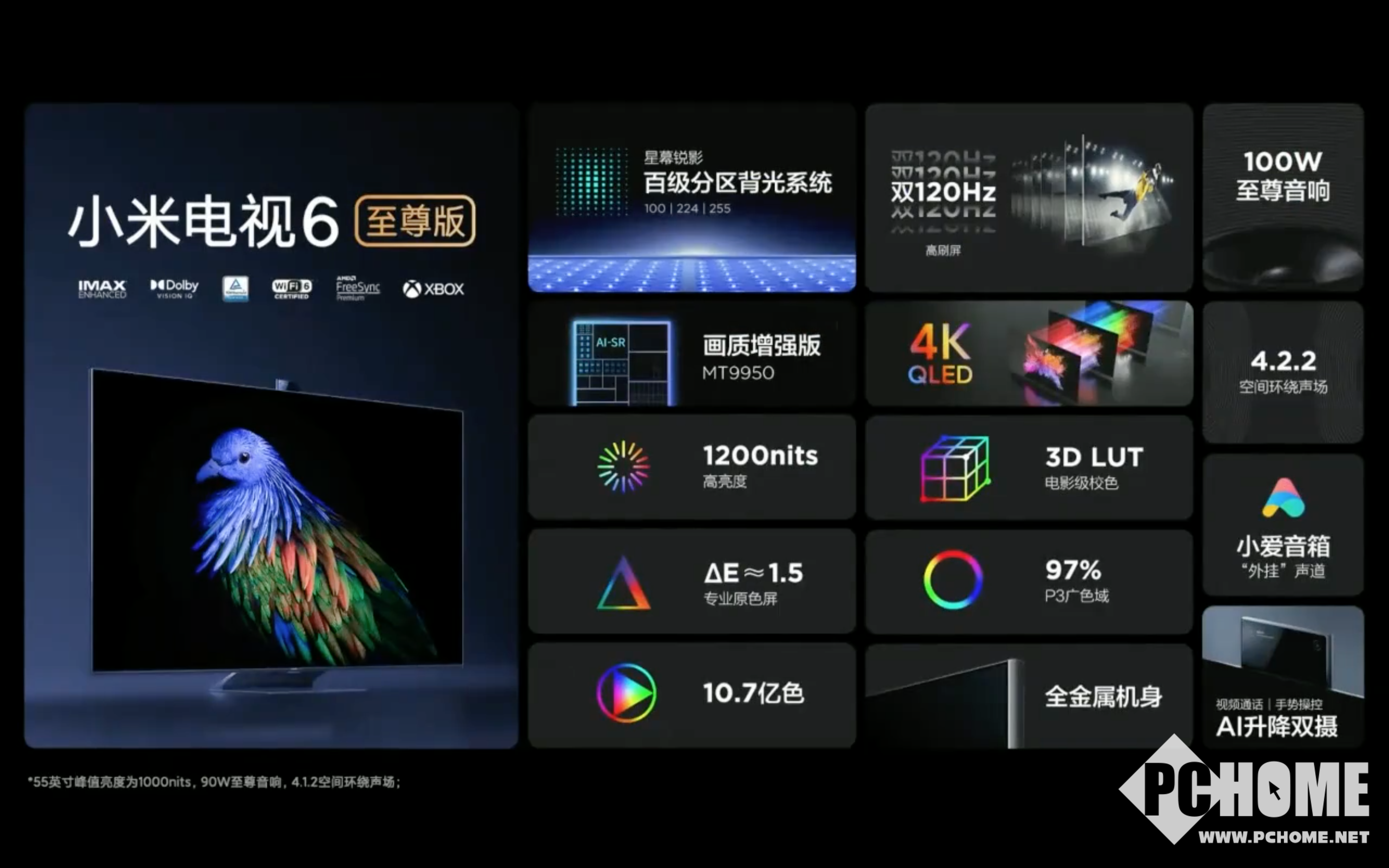 配置部分,小米电视6至尊版采用一块QLED面板,拥有更好的色域表现,出厂逐台调教DeltaE可以达到1.5的高标准。同时小米电视6至尊版支持星幕锐影分区控光技术,55村办拥有100级分区,65寸/75寸版分别拥有224/255级分区,可以实现更好的明暗效果控制。亮度方面,55寸版小米电视6至尊版可以实现峰值1000nit亮度,65寸/75寸版则可以实现1200nit峰值亮度。小米电视6至尊版内置了联发科MT9950画质增强版芯片,拥有独立NPU单元以及画质引擎,可以实现超清分辨率优化,带来更好的画面锐度效果。