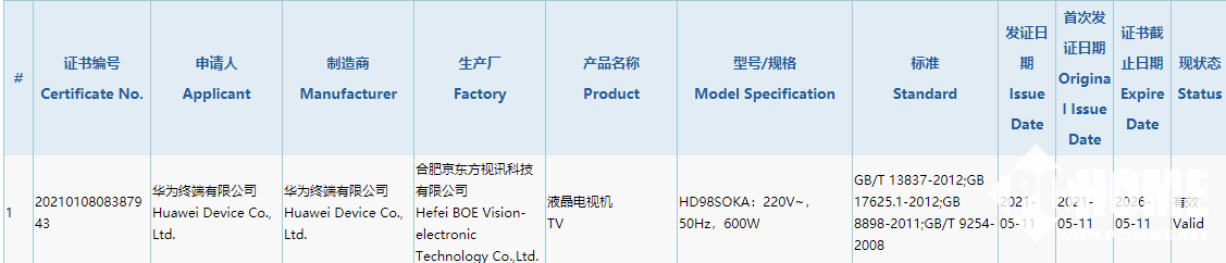 此前这位数码博主在微博也提到过好几次华为即将发布新一代V98智慧屏,但是并没有透露这款智慧屏的详细配置信息。值得注意的是,此前华为有一款型号为HD98SOKA的液晶电视通过了国家3C质量认证。根据认证显示,这款液晶电视与V系列其他机型的型号非常相似,预计这款电视就是即将发布的华为V98智慧屏,该机由合肥京东方视讯科技有限公司生产,最高600W供电。
