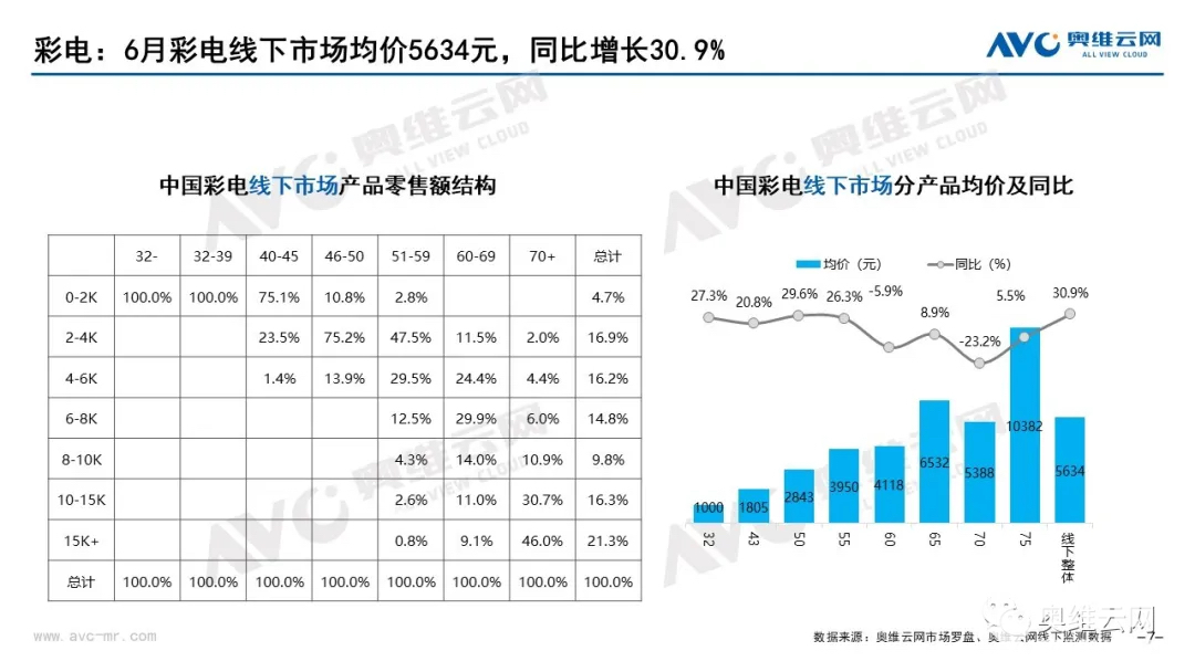 近日,奥维云网公布了2021年6月家电市场总结(线下篇)报告,报告显示2021年6月线下彩电市场销售均价为5634元,同比增长30.9%。