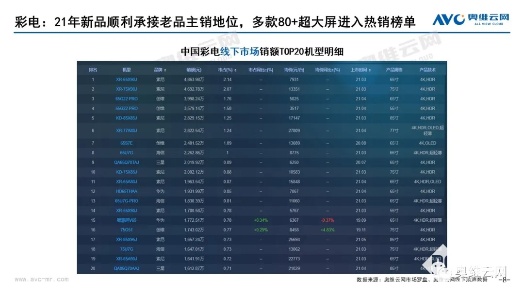 细致研究后发现,6月彩电市场线下销售额TOP20的机型中以65寸以上产品为主要销售层级,其中甚至不乏有多款75寸、80寸以上产品进入销售榜单,证明消费者对于高端大屏产品愈发青睐。监测数据显示,2021年6月彩电线下市场零售量40.3万台,环比增长2.6%,同比下降31.6%,零售额22.7亿元,环比增长10.5%,同比下降10.6%。高端市场占比达62.1%,同比增长8.0个百分点。线下均价5634元,同比增长30.9%。OLED、人工智能、全面屏等新技术产品的渗透率持续提升。