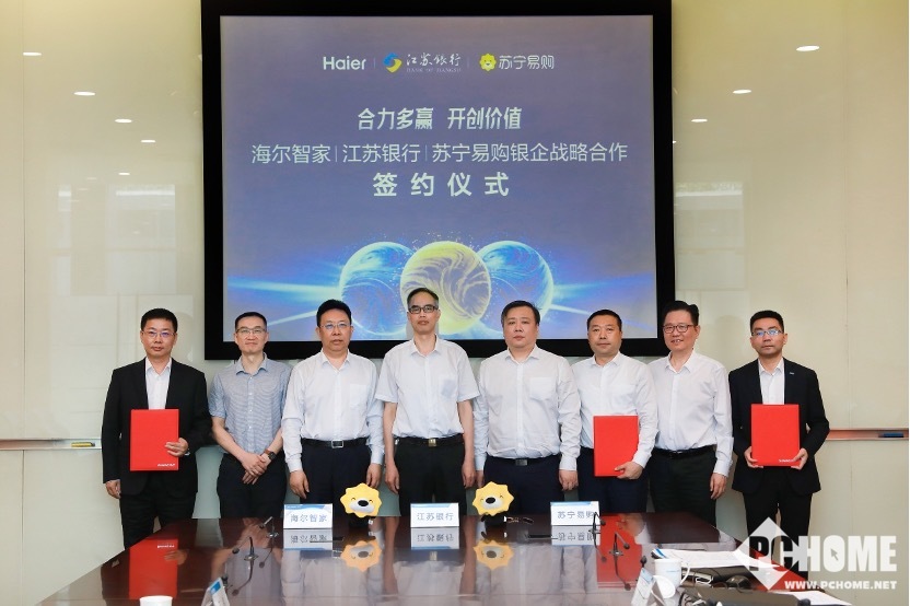 7月19日,苏宁易购、海尔智家、江苏银行联合举办战略合作签约仪式,探索银企合作新模式。