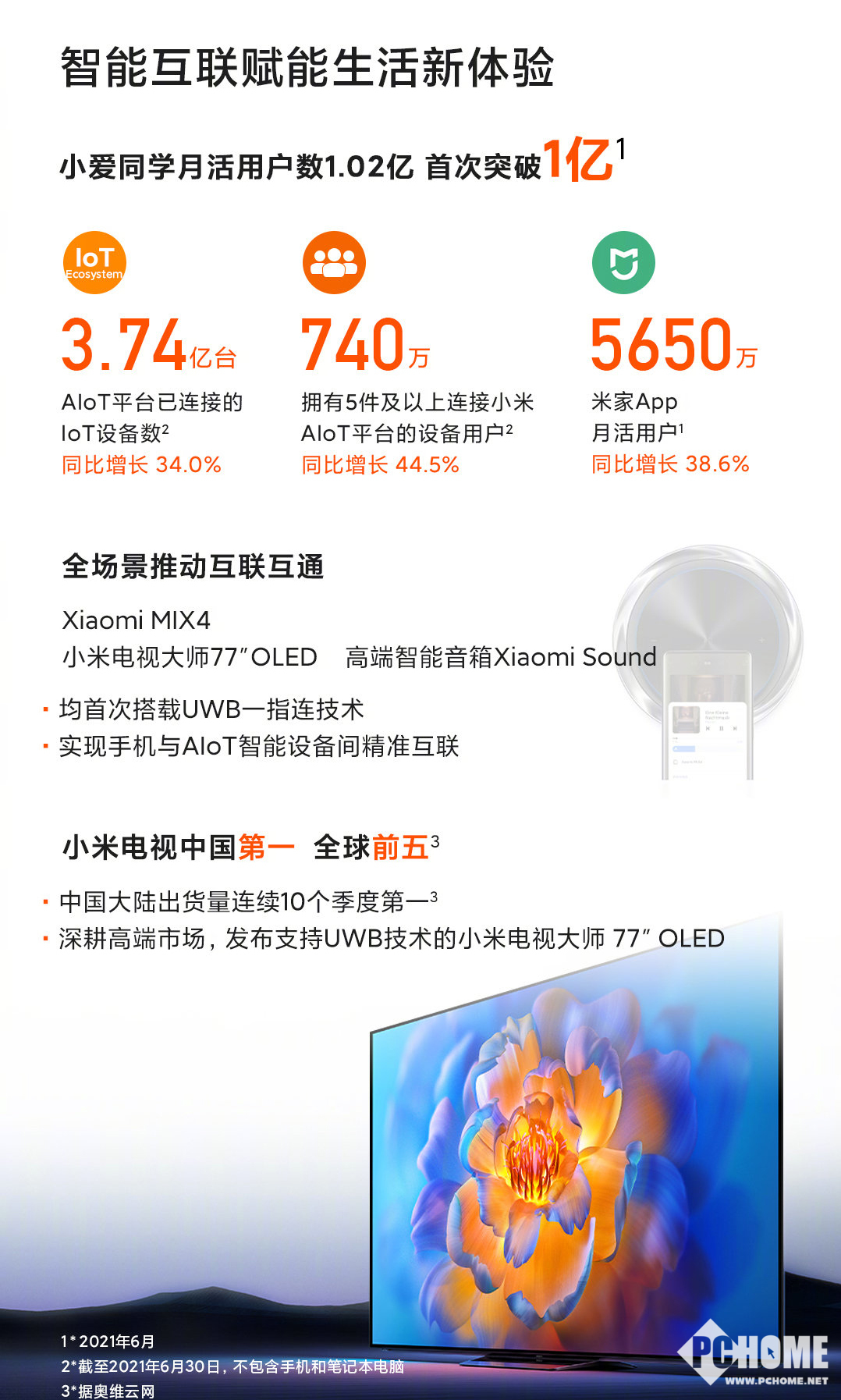 电视业务方面,小米电视目前稳定在中国市场第一、全球市场第五名的位置,且小米电视已经连续10个季度在中国市场取得第一名成绩。前段时间小米刚刚发布的小米电视「大师」77''OLED更是首发支持UWB超宽频技术,可以与小米MIX 4手机和小米Sound高端音箱实现一指连,实现手机与AIoT设备之间的精准互联。
