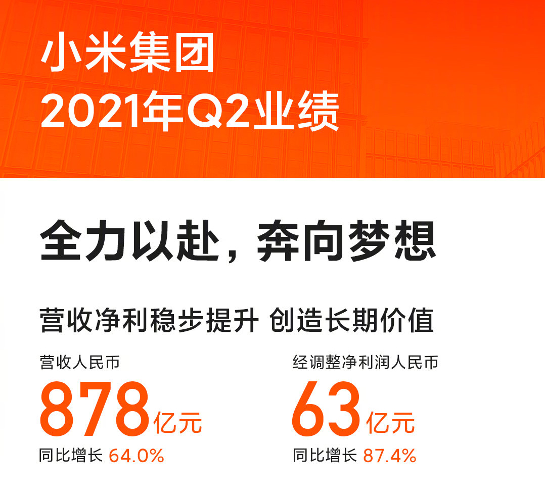 8月25日,小米公司公布2021年Q2季度财报,数据显示小米集团2021年Q2营收878亿元,同比增长64.0%;经调整净利润63亿元,同比增长87.4%,再度刷新单季最高记录。智能手机出货量排名首次晋升全球第二,高端产品表现优异。智能生态成绩耀眼,小爱同学月活用户首次破亿,小米电视连续10个季度中国第一。